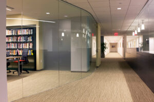 An undulating wood panel ceiling animates the interiors while accommodating the building systems. Perimeter wall soffits that enclose the principal ductwork create seating study alcoves at windows. The building’s exterior renovation included repairing deteriorating conditions, constructing a new mechanical penthouse, and upgrading the structure’s fenestration to current energy standards.