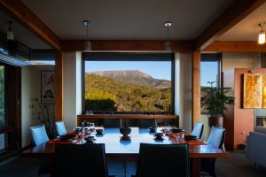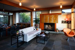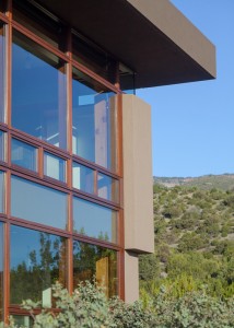 Both post-and-beam structures incorporate earth-tone colors with mahogany windows with low-e glass, cherry wood and bluestone flooring, and weathering steel panels.