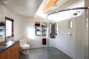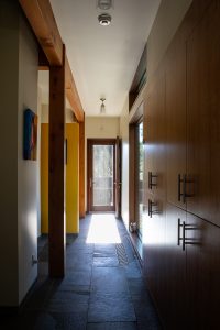 The construction of the well-insulated solid walls and roof, and location of fixed and operable window are part of a passive solar design that permits abundant natural light and ventilation throughout the houses.