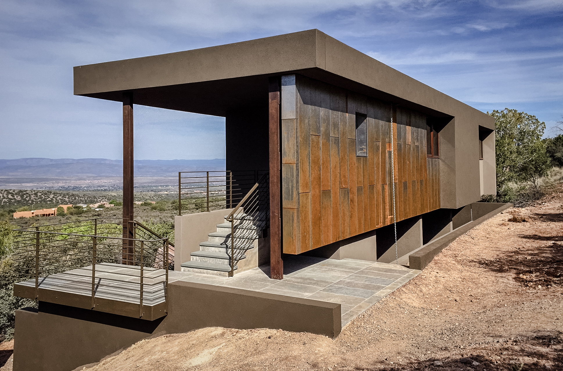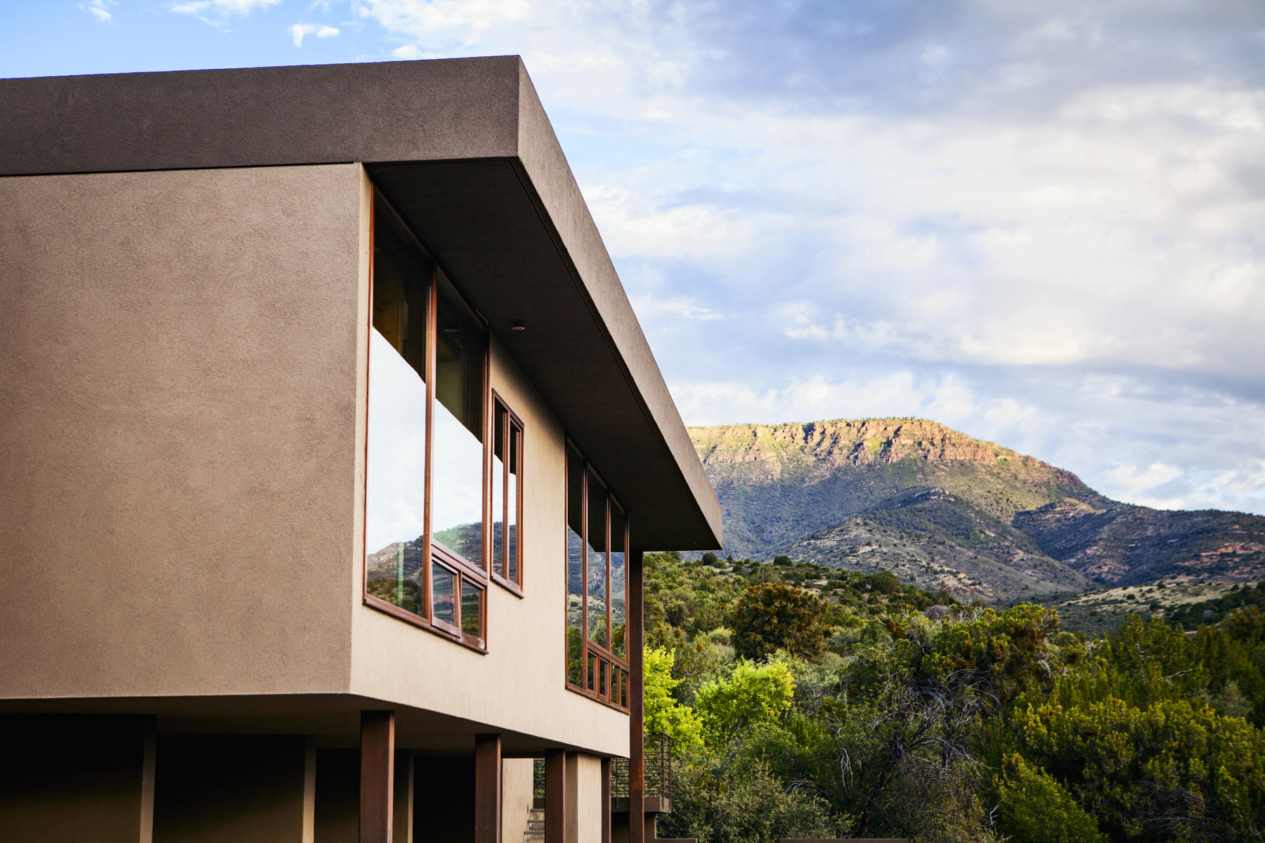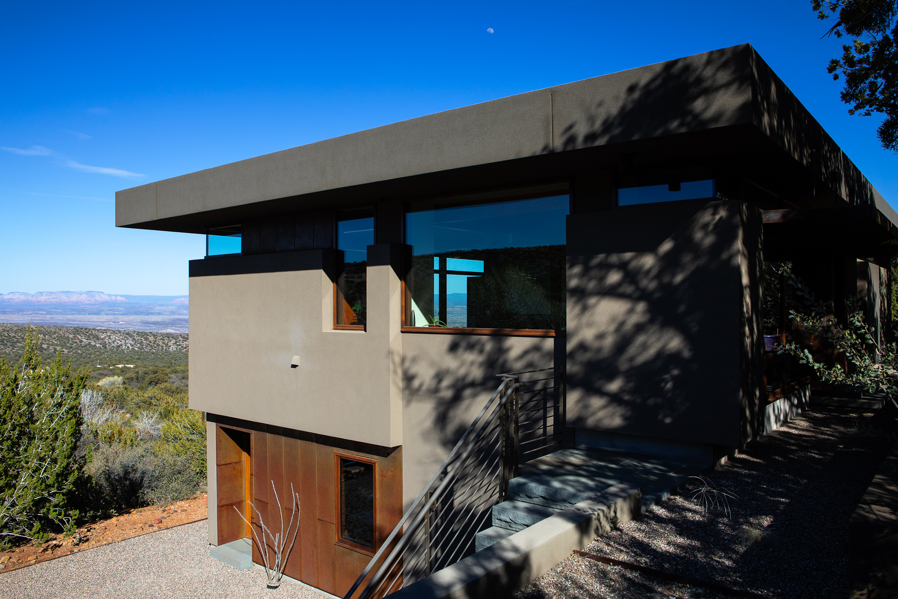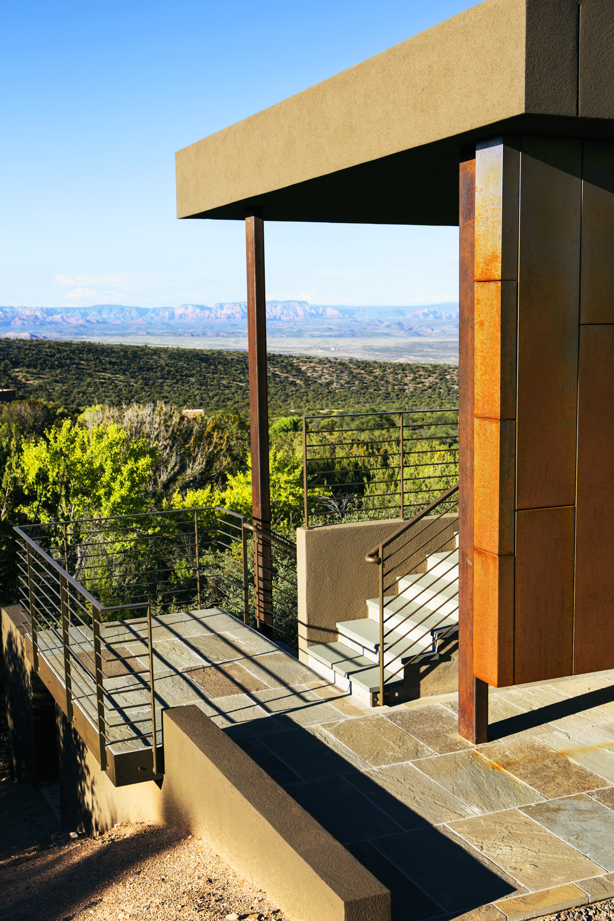 Situated in the foothills of Mingus Mountain, the house is nestled into the high end of 2.6 acres with expansive valley and mountain views. Envisioned as a series of elements rising and falling with the topography, the main house is reached through a series of terraces carved into the hillside.