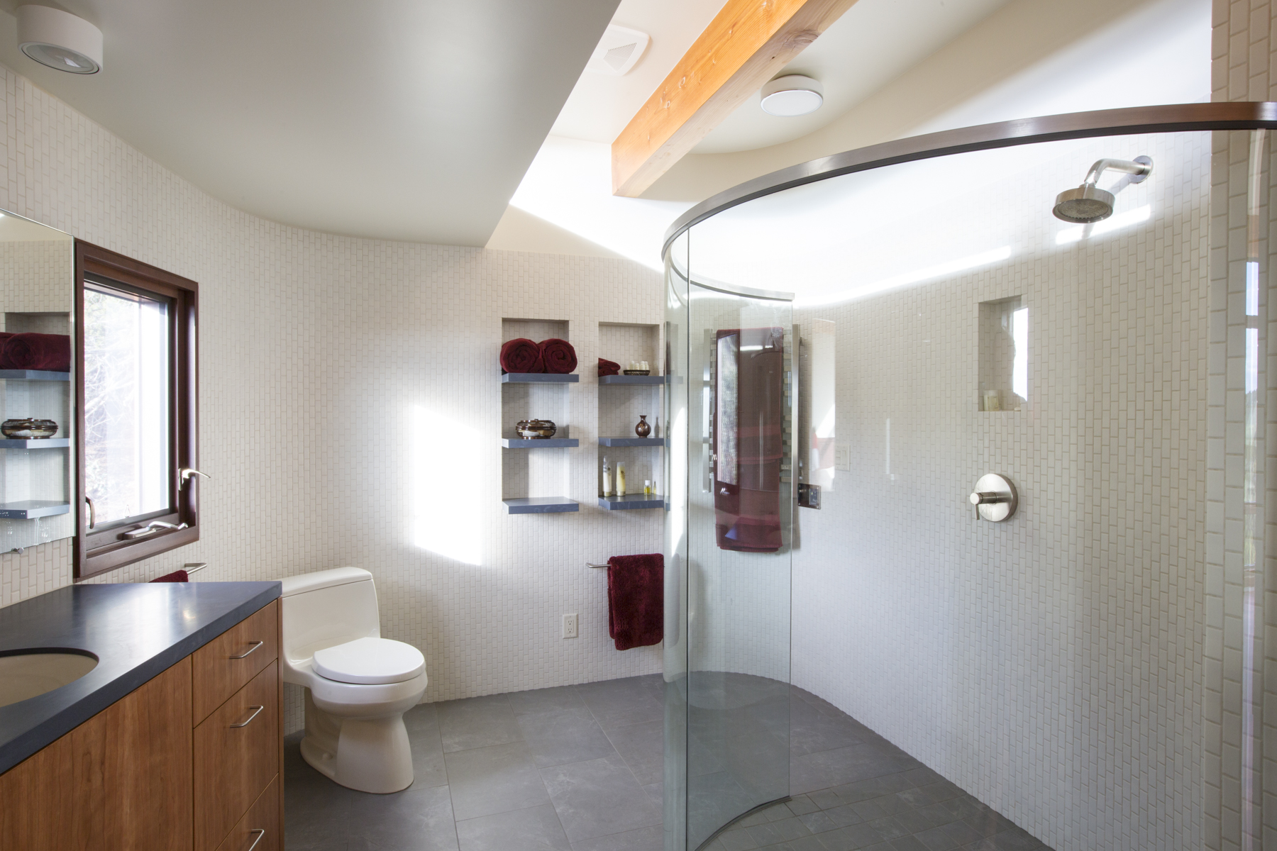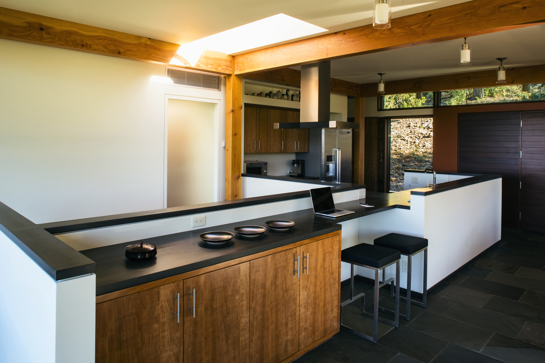 Large glass surfaces provide transparency, connecting inside to outside with views focused in each direction. Solar angle studies were done to inform overhang dimensions, maximizing winter sun and summer shade.