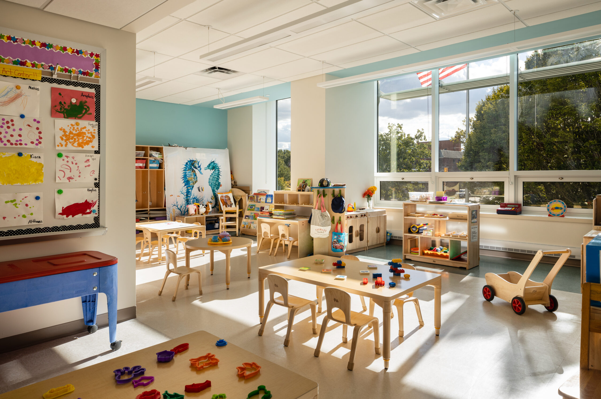 The MDSA-designed Pre-K Center in Queens opened in September of 2022. The school exhibits a mixture of colors, materials and textures, common in the work of the firm, and fitting to the Mosaic name. The new center features include –
