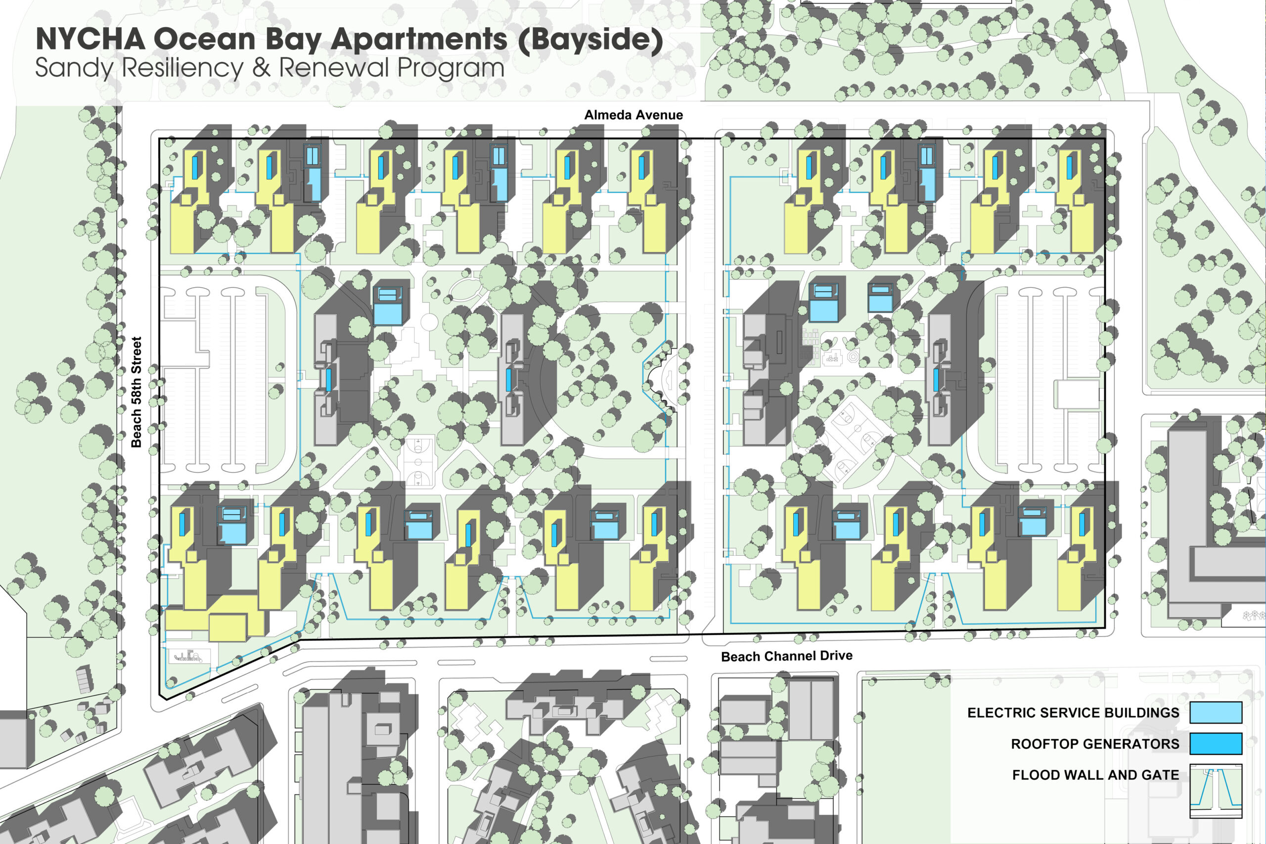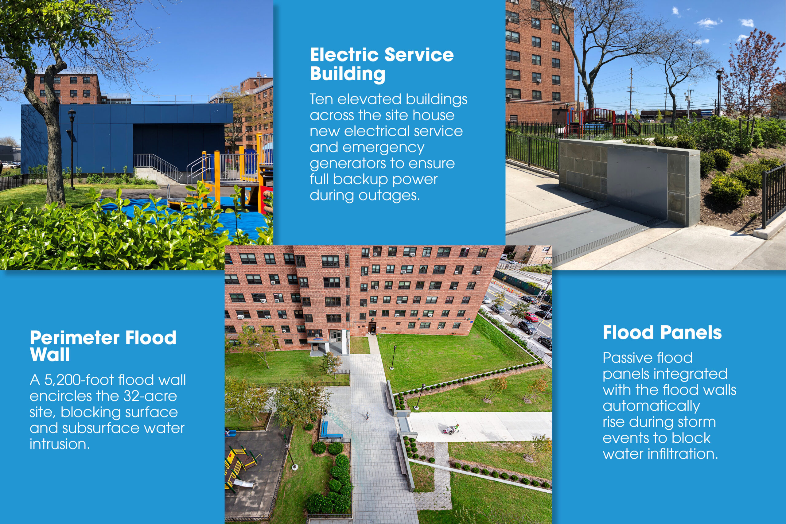 One powerful example is our work on the Bayside Houses Resiliency & Renewal Project for the New York City Housing Authority (NYCHA), designed to safeguard over 6,000 residents in Far Rockaway, Queens.